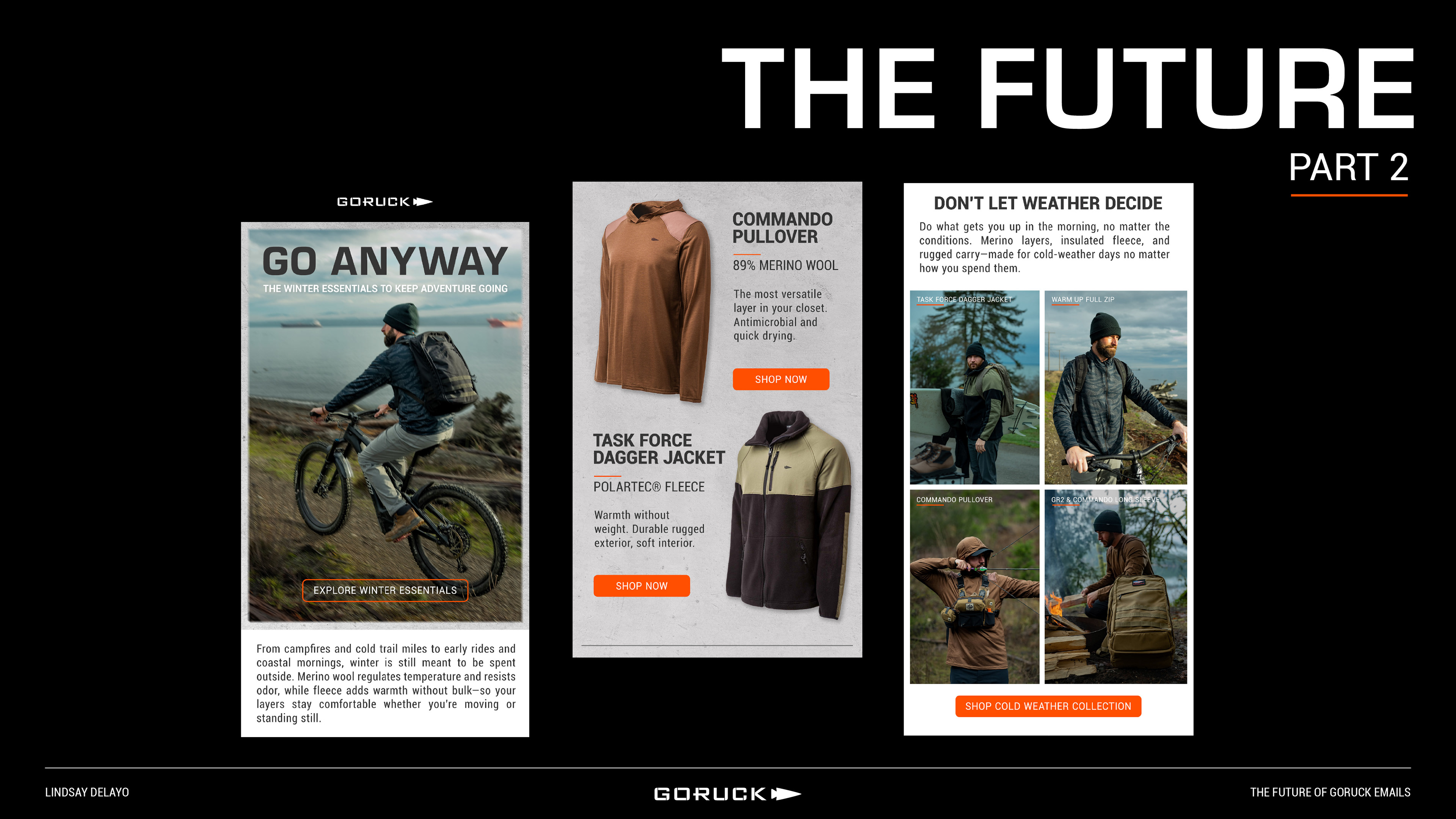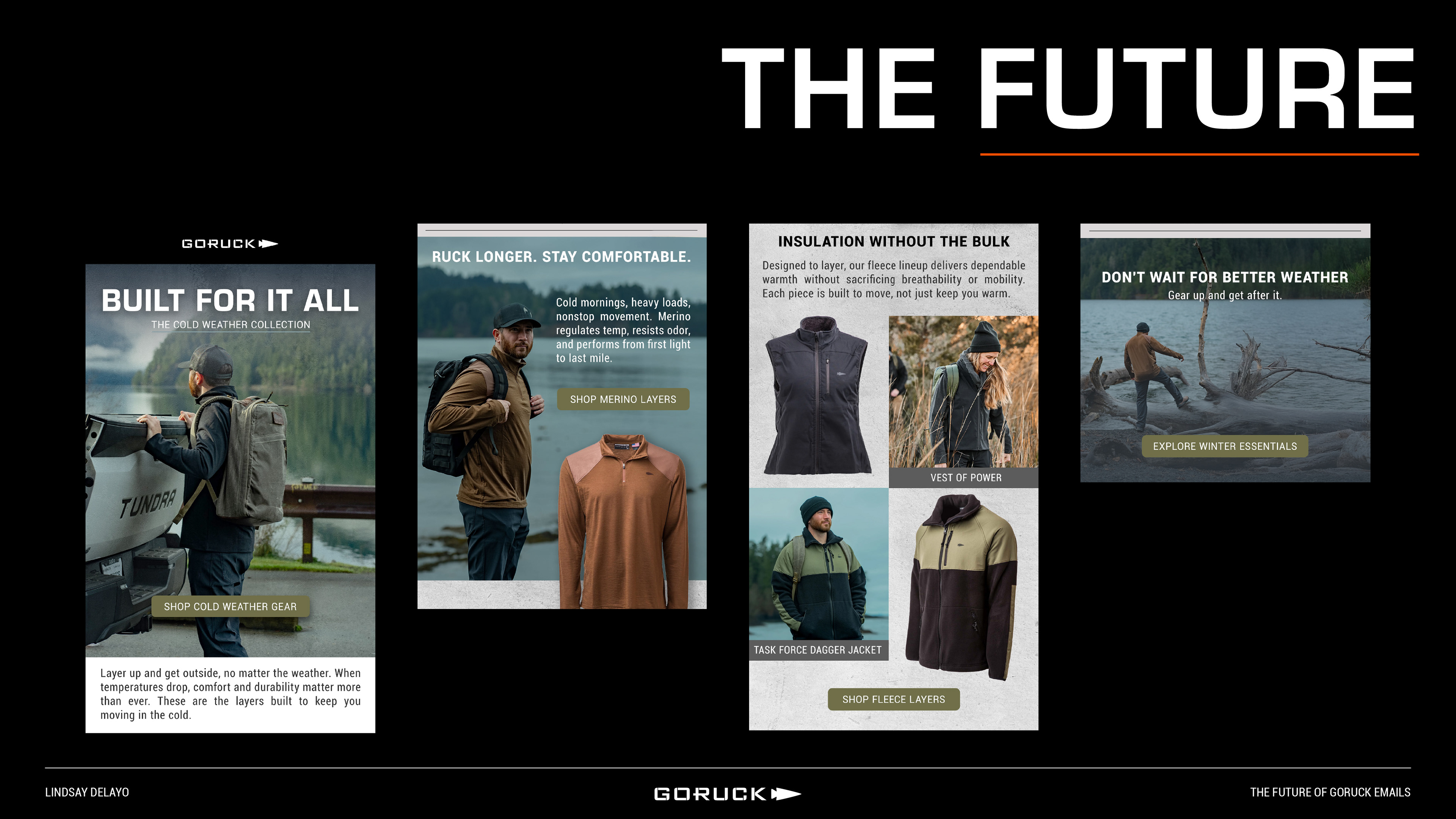 In my role as Graphic Designer at GORUCK, I owned the email design ecosystem, developing layouts, visual systems, and assets to support ongoing campaigns and product launches. In addition to email, I created supporting illustrations and print materials, building cohesive campaign experiences across channels. This work showcases versatility across digital and physical mediums while maintaining GORUCK’s bold, performance-driven brand.